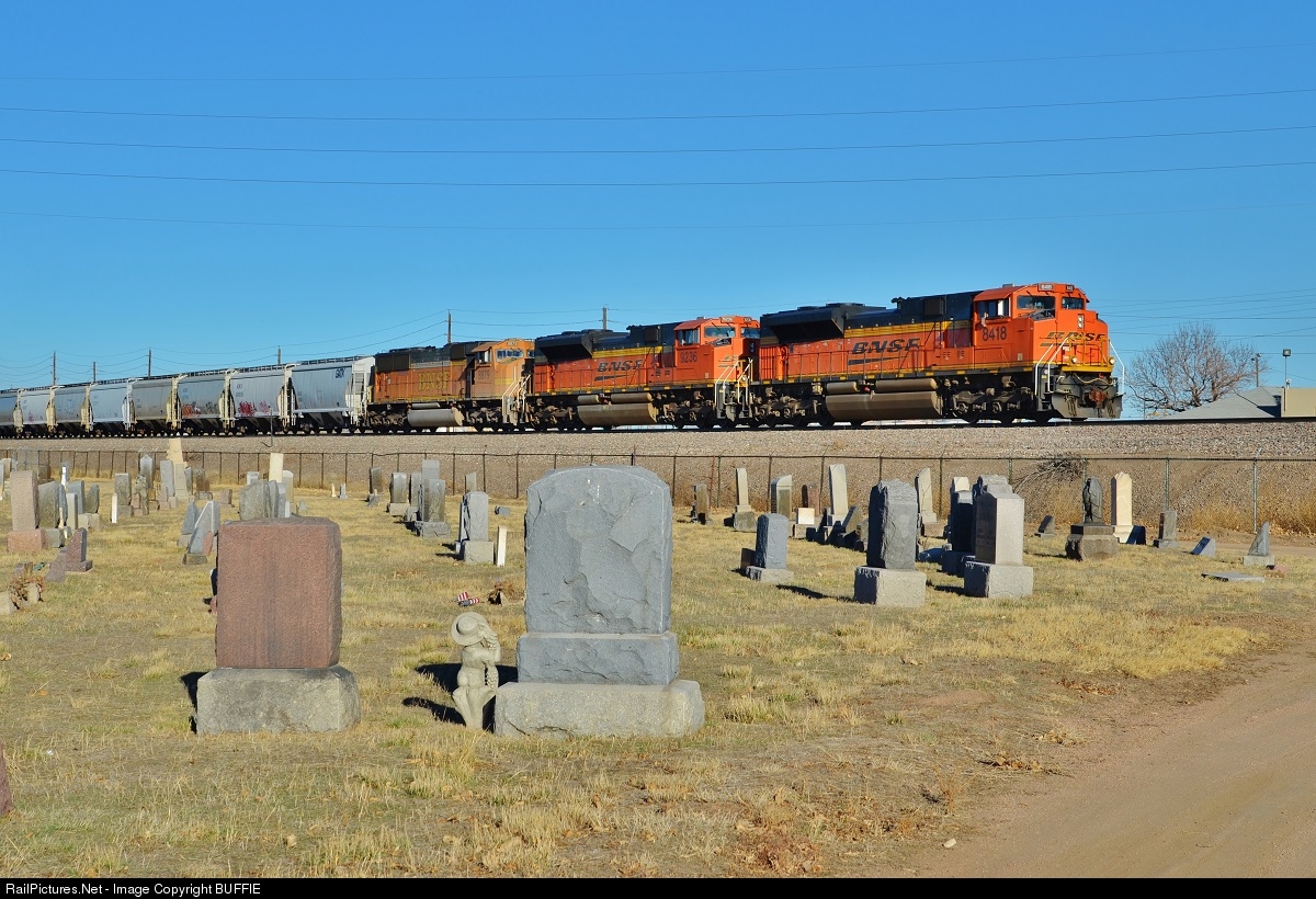 BNSF 8418 (SD70ACe) leads a hopper train past the Riverfont Cemetery.