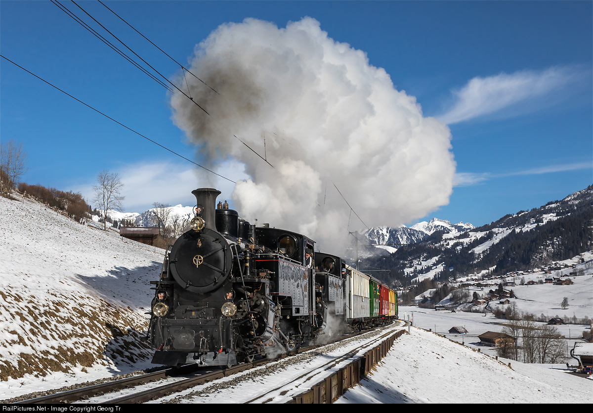 | As a prelude to the celebrations of the 50th anniversary of the museum railway Blonay-Chamby, a winter steam train operated on 4th March from Zweisimmen to Montbovon (-Montreux). The cogwheel locomotive HG 3/4 # 4 of the Dampfbahn Furka Bergstrecke (DFB) as a guest on the Blonay-Chamby (BC) and the HG 3/4 # 3 of the BC ex BFD/FO pull the 8-car train on a gradient of 4.0 % near the Moosbachgraben between Zweisimmen and the crossing station Halten on the line of the Montreux Oberland Bernois (MOB).