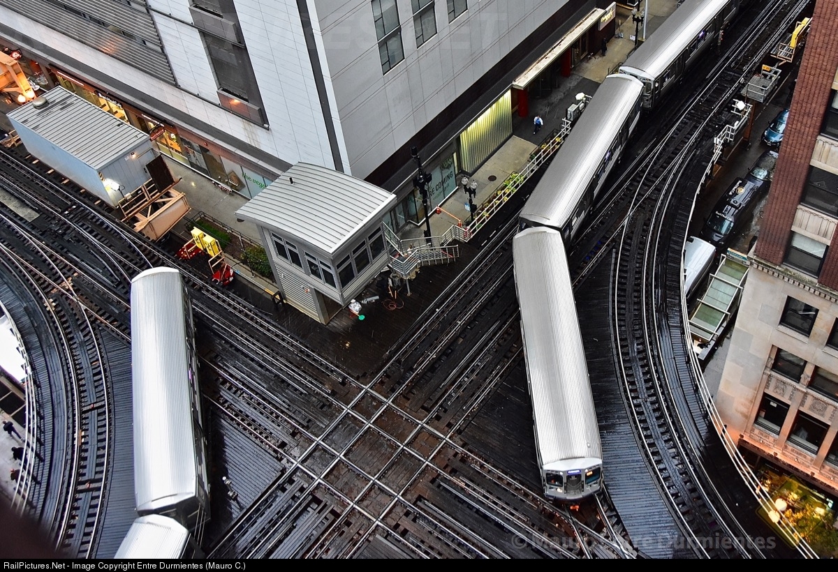 Rainy day in the busy Junction 18 Wells & Lake Interlocking in Downtown Chicago. Meeting of several trains in the complex junction of "Metro" Chicago Transit Authority, one of the busiest junctions in the world. View of the junction at the northwest corner of the Loop, very entertaining to be watching as trains pass in every moment and without rest.