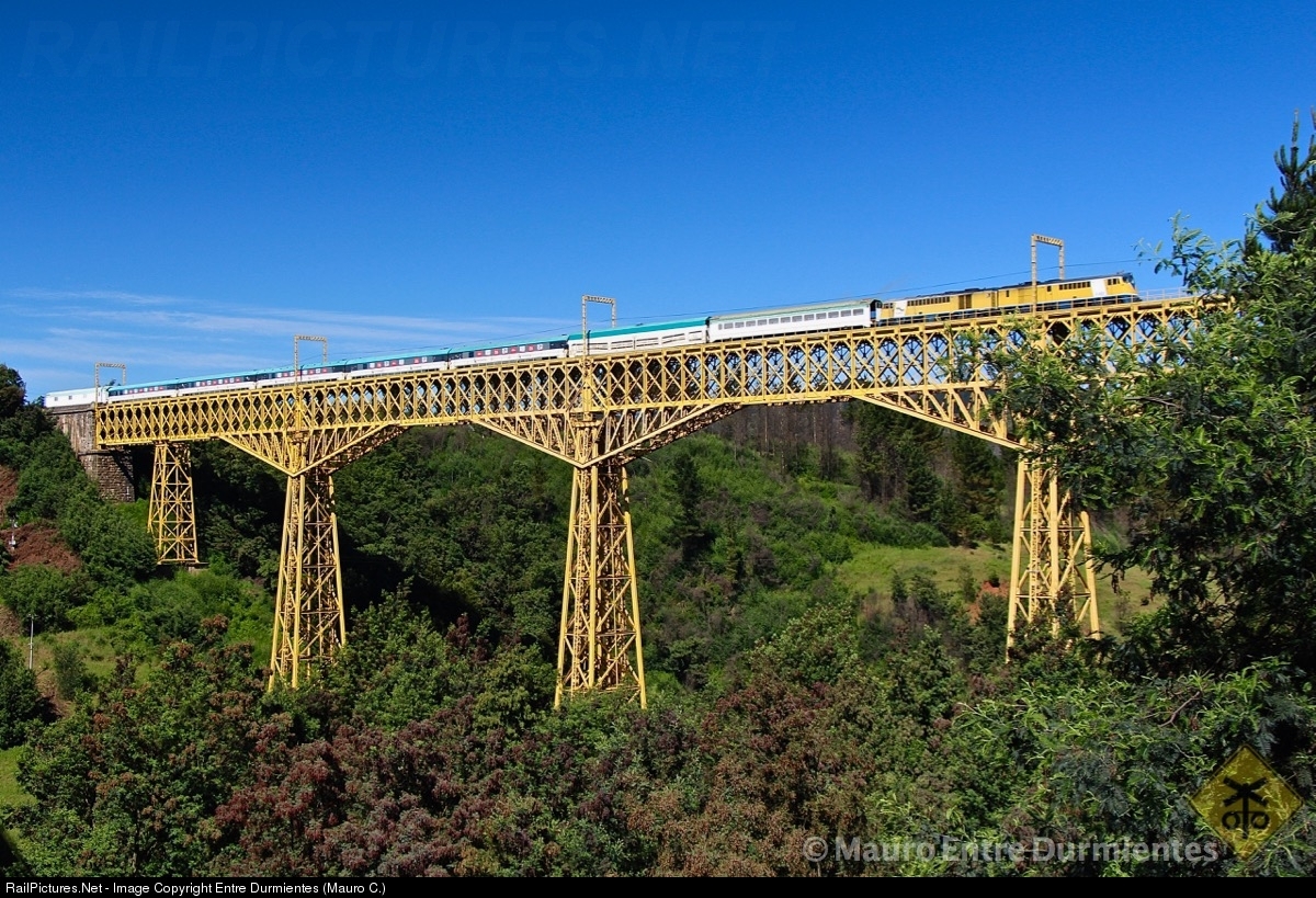 A duo of GE 105t locomotive with ALCO engine, drag a special pasenger service Temuco - Santiago, and cross the massive Malleco Viaduct (with its 102 meters high, 348 meters long and 127 years of life). My thanks to my friend Ricardo Donoso.