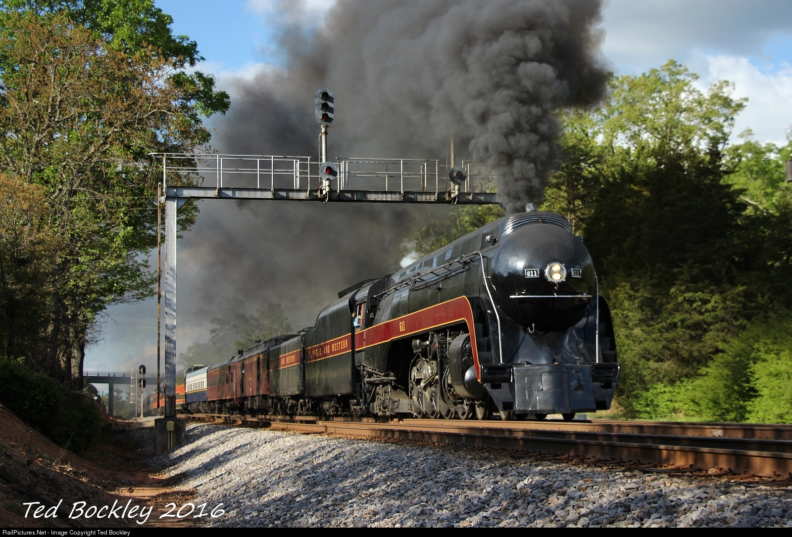 N&W 611 puts on a display of raw power, engulfing the Southern Rwy signal bridge in a cloud of thick black smoke. The excursion is returning to Greensboro, NC after a trip to its hometown of Roanoke.