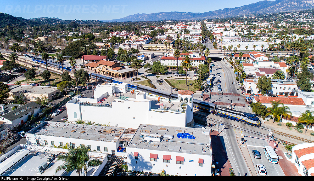 | Slowing on its approach to the original Southern Pacific depot now used by Amtrak in Santa Barbara, Amtrak 761 prepares to stop with pieces of extra equipment on the rear assisting in the massive increase in ridership during the Montecino mudslides. |