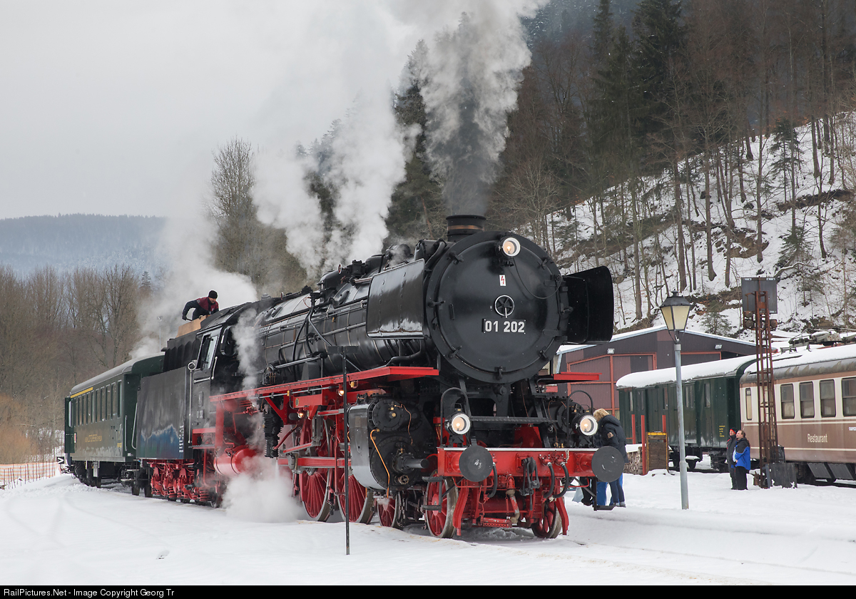 | The former german express train steamlocomotive 01 # 202 of association "Pacific 01 202" at Lyss, made a test run after several boiler works (replacing of stay bolts etc.), renewal of a coupling rod bearing and boiler inspection. The 4-6-2 "Pacific" reached the site of association VVT (Vapeur Val de Travers/Steam in the Travers valley) at St-Sulpice, for taking water and moving forward of coal in the tender. |