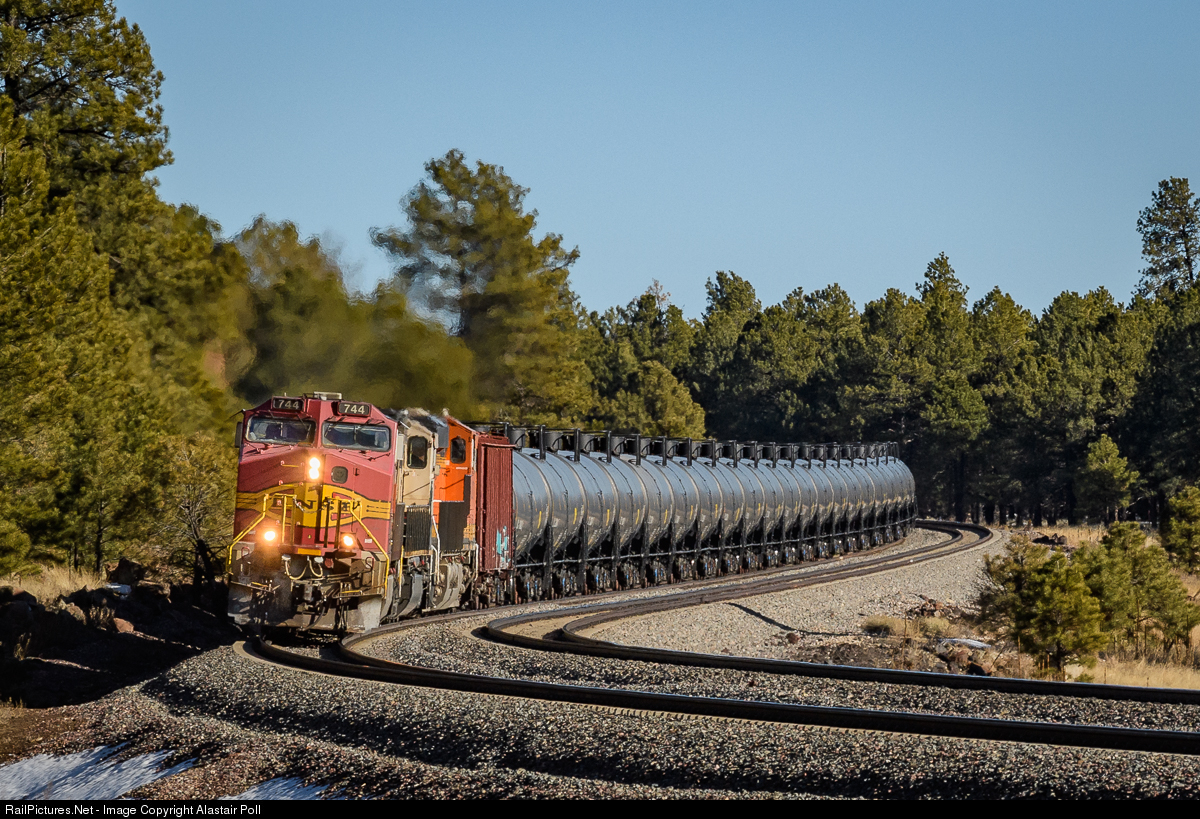| After being held in Flagstaff for an hour due to other train traffic, BNSF 744 races west through the s-curve at Bellemont, AZ leading a westbound oil train. |