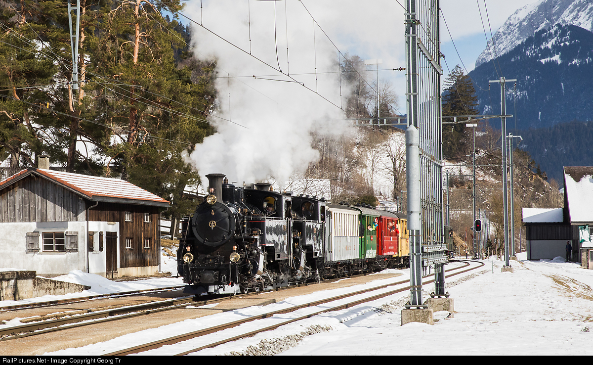 The winter steam train "Train des Neiges", as prelude for the 50th anniversary of the Blonay-Chamby Railroad Museum, is entering Rossinière. Pulling are cogwheel locomotives HG 3/4 # 4 of the Dampfbahn Furka Bergstrecke (DFB), as guest on the BC in the moment, and HG 3/4 # 3 of the BC. Both locomotives were built in 1913 for the Brigue-Furka-Disentis (BFD), which became later the Furka-Oberalp Bahn (FO).