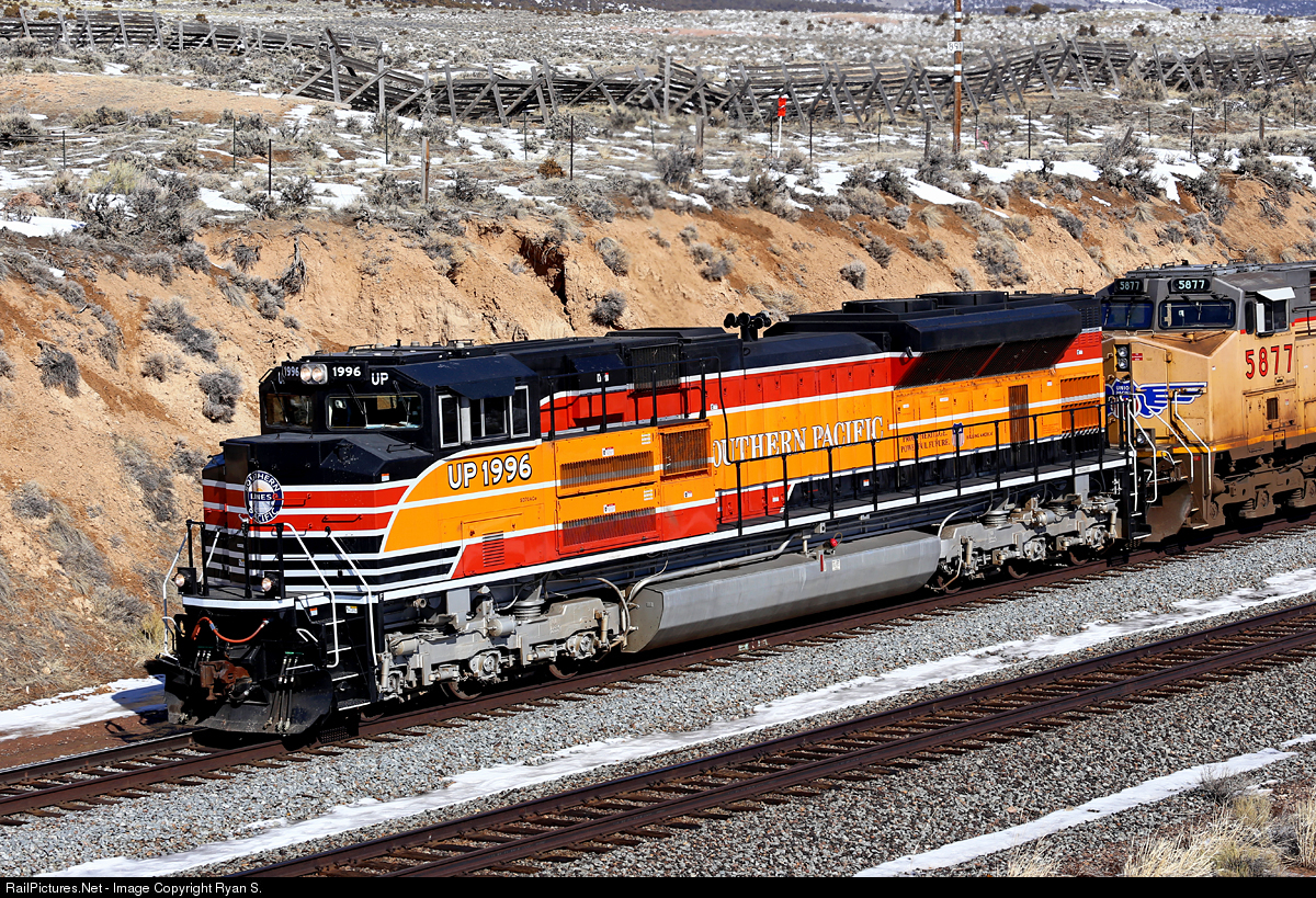 Nearly one year after its repaint in fresh heritage colors, UP 1996, Southern Pacific heritage, still cleans up good. Seen departing Leroy after pausing for a track inspector's track & time 1996 is again on the pull west towards the top of the grade at Altamont, WY.