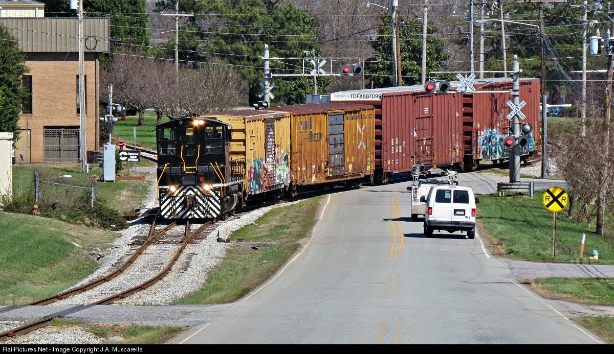 | Returning from International Paper in Statesville: The prospering line that is the Alexander Railroad is hard at work serving one of their many customers on this roughly 20-mile line. After dropping a cut of cars at the NS Interchange, the crew then worked International Paper. This small cut of box cars will also be moved to the interchange once the crew is done working that spur. International Papers' location provides a neat perspective for those interested in photographing this operation as you can shoot from on top of a small hill down toward the crossing. |