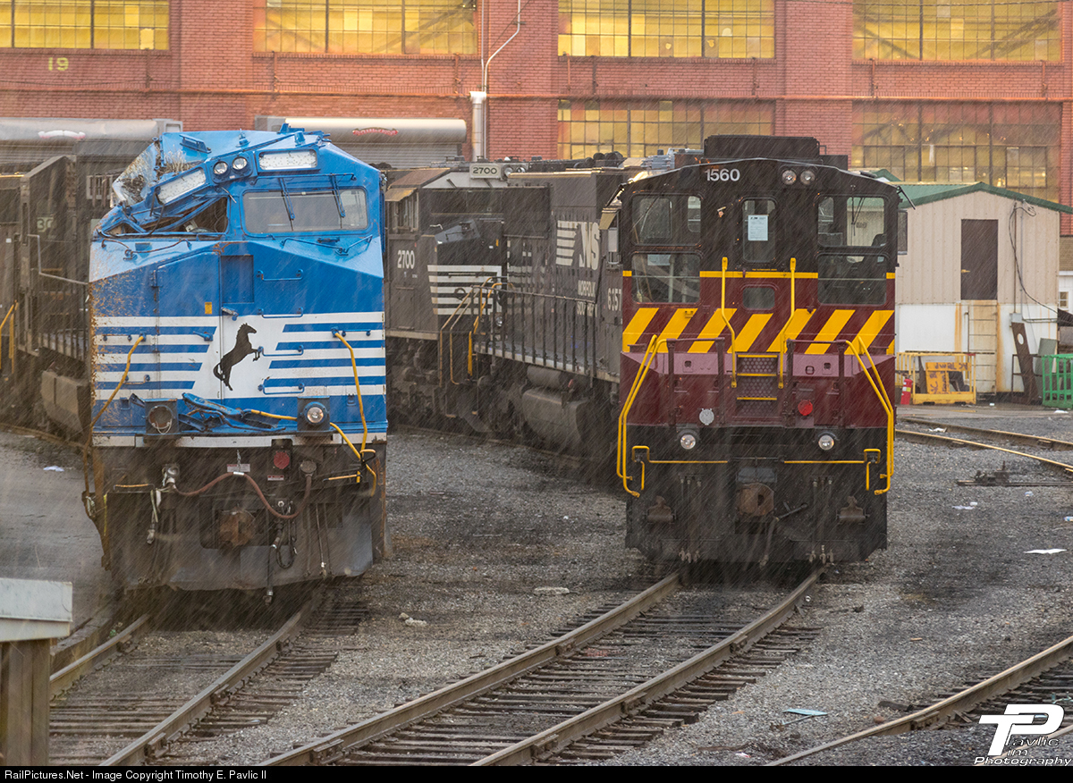 ...despite popular belief. Though the talented shop force at Juniata probably can fix anything. NS 4001, the AC44C6M that was involved in the 593 derailment at CP McVey on April 15, 2017, was recently moved from its storage location to the Erecting Shop for repairs. It's not going to be a quick process--while the frame is apparently salvageable, the engineer's side of the long hood and cab were damaged considerably. The fact that the crew walked away from this with relatively minor injuries still amazes me. The trailing unit, SD70ACU 1036, has been in the shop for a couple months now. At the time this was taken, 4001 was parked between in-sourced projects Delmarva Central 1560 and CEFX (ex-SOO) 6006.