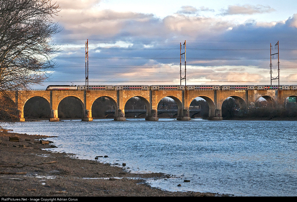 An eastbound Trenton to New York local crosses the Raritan River as the sun sets and casts its last rays of light.