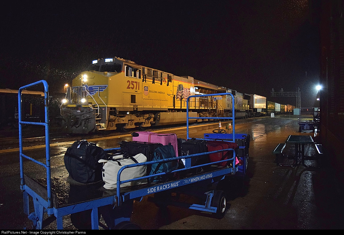 | While a light rain falls through the late evening air, UP 2571 leads a westbound intermodal past the Longview Amtrak Station while baggage for the northbound Texas Eagle waits in the foreground (and gets soaked). |