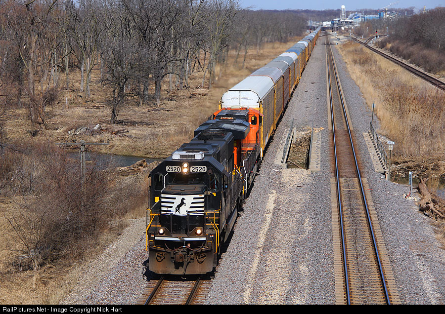 | A Norfolk Southern SD70 is in charge of this westbound vehicle train on the BNSF Chillicothe Sub as it makes its way through Elwood, about to pass under Arsenal Road. |