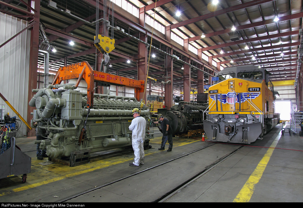 A new prime mover is being prepared for installation in Union Pacific GE AC4400CW No. 6704 during an overhaul at UP’s South Morrill Locomotive Facility on September 14, 2017. The old prime mover is sitting next to No. 6778. During this overhaul, the old generator still being good-order, will be transferred to the new prime mover before being installed into No. 6704. Sister GE AC4400CW No. 6778 is having PTC electrical work done in the shop.