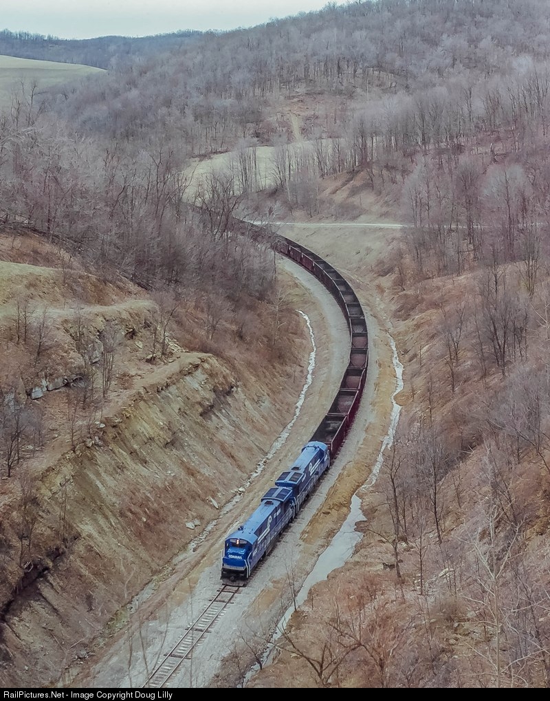 | A pair of Conrail C30’7’s lead a train of empties south on the Monongahela’s Waynesburg & Southern division at White Cottage, Pennsylvania. The train is traversing the large cut approaching the north end of White Cottage tunnel. |