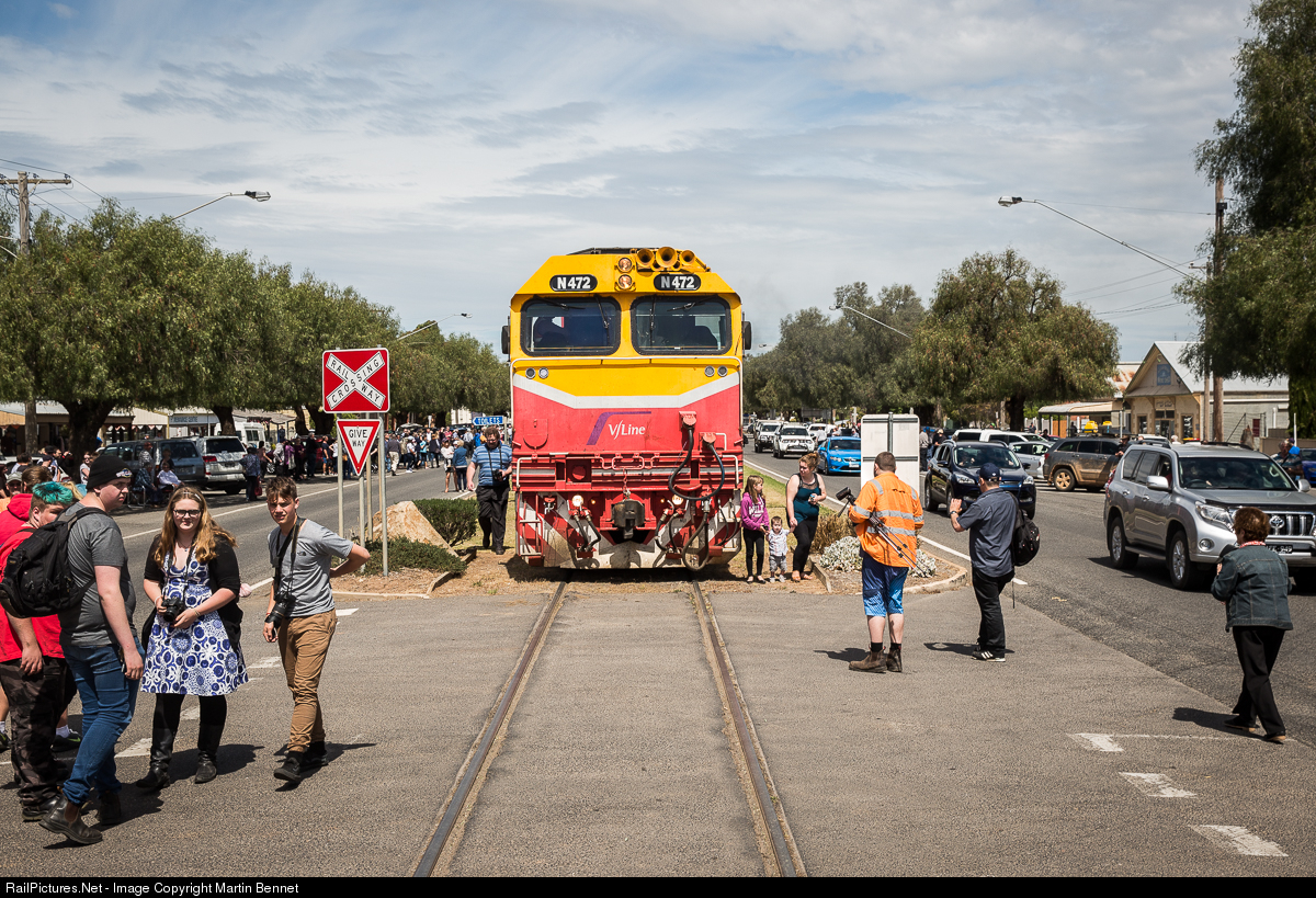 V/line's N472 makes an unusual sight in the middle of the main street of Wycheproof, with Steamrail Victoria's 'Farewell Broadway Broad Gauge' tour. Behind the N class are heritage diesel T356 and 4-6-0 steam locomotive A2 986. Wycheproof is the only location in Victoria to feature a substantial section of street trackage, and is soon to be converted to Standard Gauge, making it unlikely that a VR steam locomotive will visit the location again.