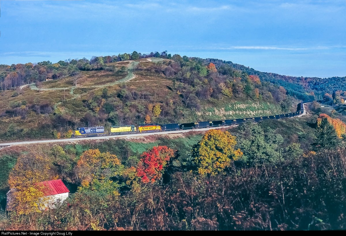 | With a long train of Wisconsin Electric Power hoppers, one Chicago & North Western and two CSX EMD’s roll through the hilly farmland at Buzz, Pennsylvania. The two CSX/one CNW power combination was one that was on every WEPX train that I witnessed on the Monongahela, most likely approximating the ratio of mileage division between the two roads. It was not unusual for the MGA to add a fourth unit at West Brownsville. |