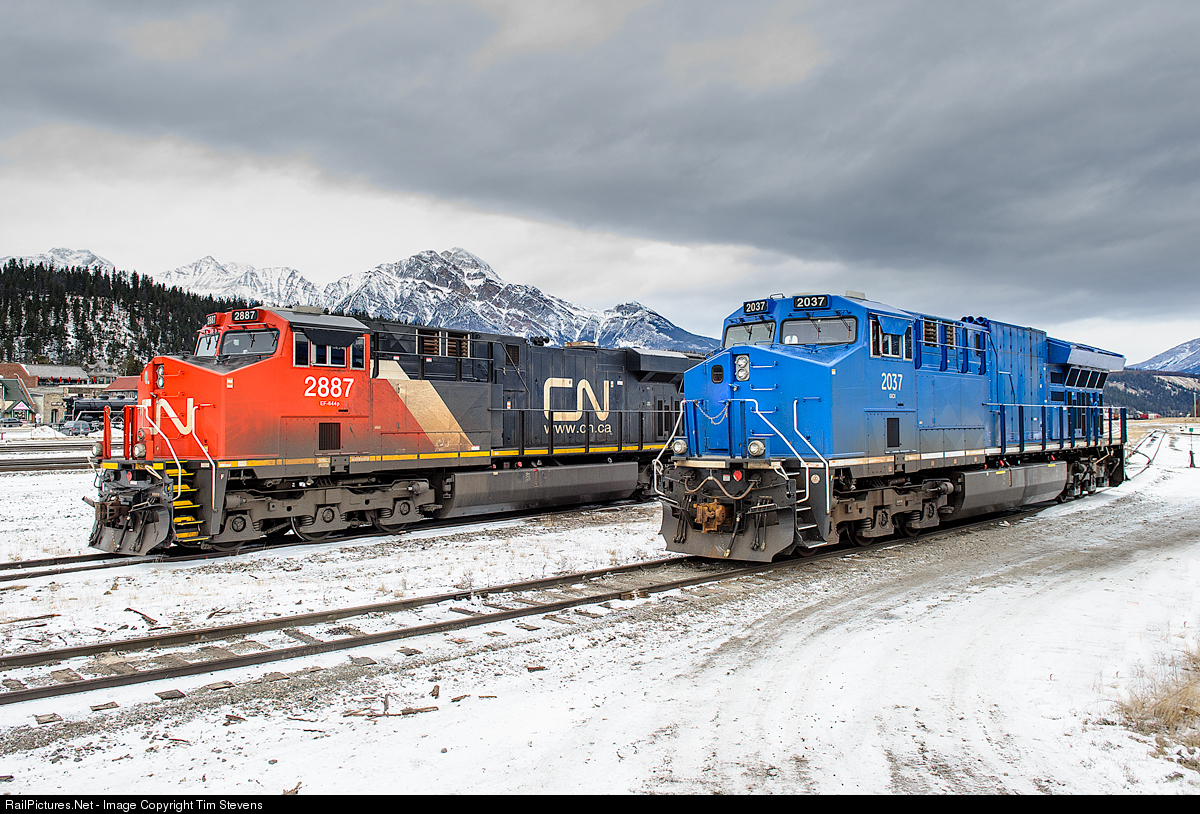 CN ES44AC 2887 and GECX ET44AC 2037 idle side by side on the shop tracks in Jasper. Pyramid Mountain looks on in the distance as the skies threaten.