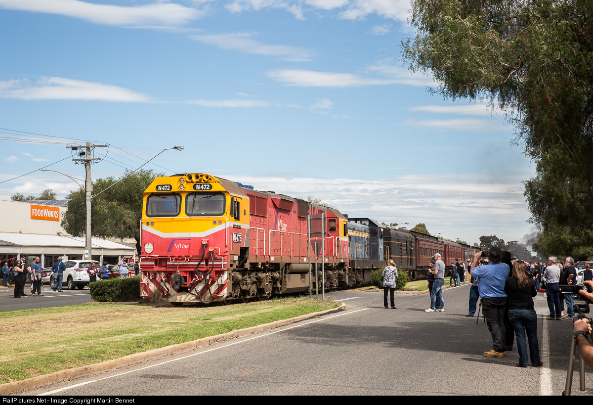 V/line's N472 and Steamrail's T356 trail the Farewell Wycheproof Broad Gauge special, seen here in the main street of Wycheproof. Steam locomotive A2 986 is at the head of the train. In coming months the line will be converted to Standard Gauge as part of the Murray Basin Rail Project. The appearance of an N class on this tour was required as none of Steamrail's diesels had yet been fitted with the new digital train radio system. The presence of the N was historic in its own right, as it was quite possibly the first time one had visited this location.