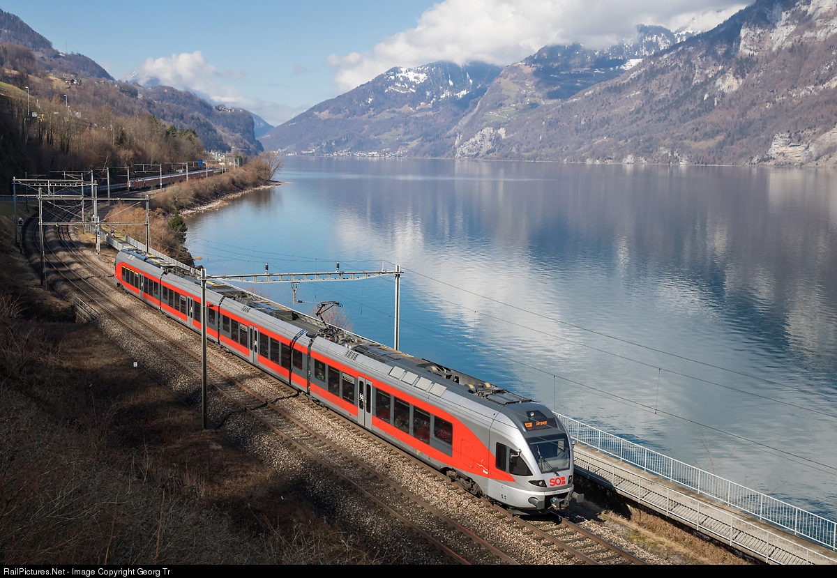| "Flirt" RABe 526 # 053 "Etzel" of the Südostbahn (SOB) is running the S 4 service 23444 "round the Säntis" along the shore of the Walensee near Murg. The hourly service run from St.Gallen via Herisau-Wattwil-Uznach-Ziegelbrücke-Sargans-Buchs (SG)-St.Margrethen-Rorschach back to St.Gallen, and another train is going the other way round. |