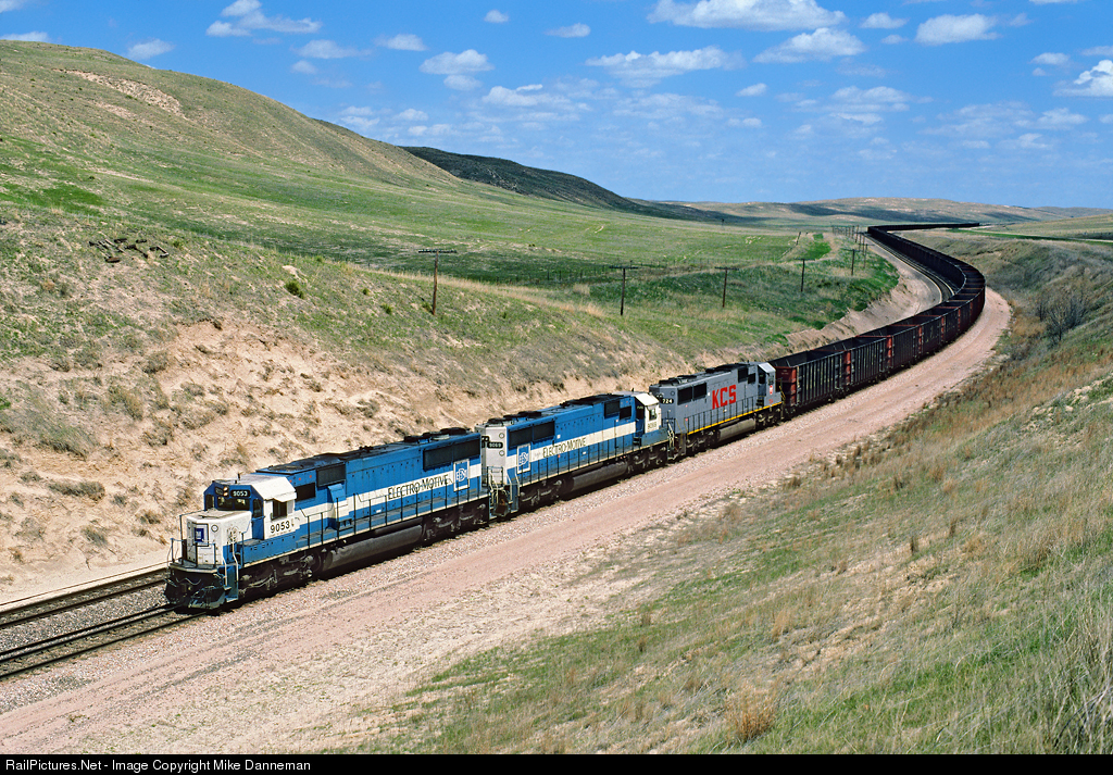 Sandhills SD60s A Burlington Northern coal empty is westbound out of Ashby, Nebraska, heading for Alliance on a trip through the Sandhills on May 11, 1995. A trio of EMD SD60s power the train—Oakway Leasing Nos. 9053 and 9069, along with Kansas City Southern No. 724.
