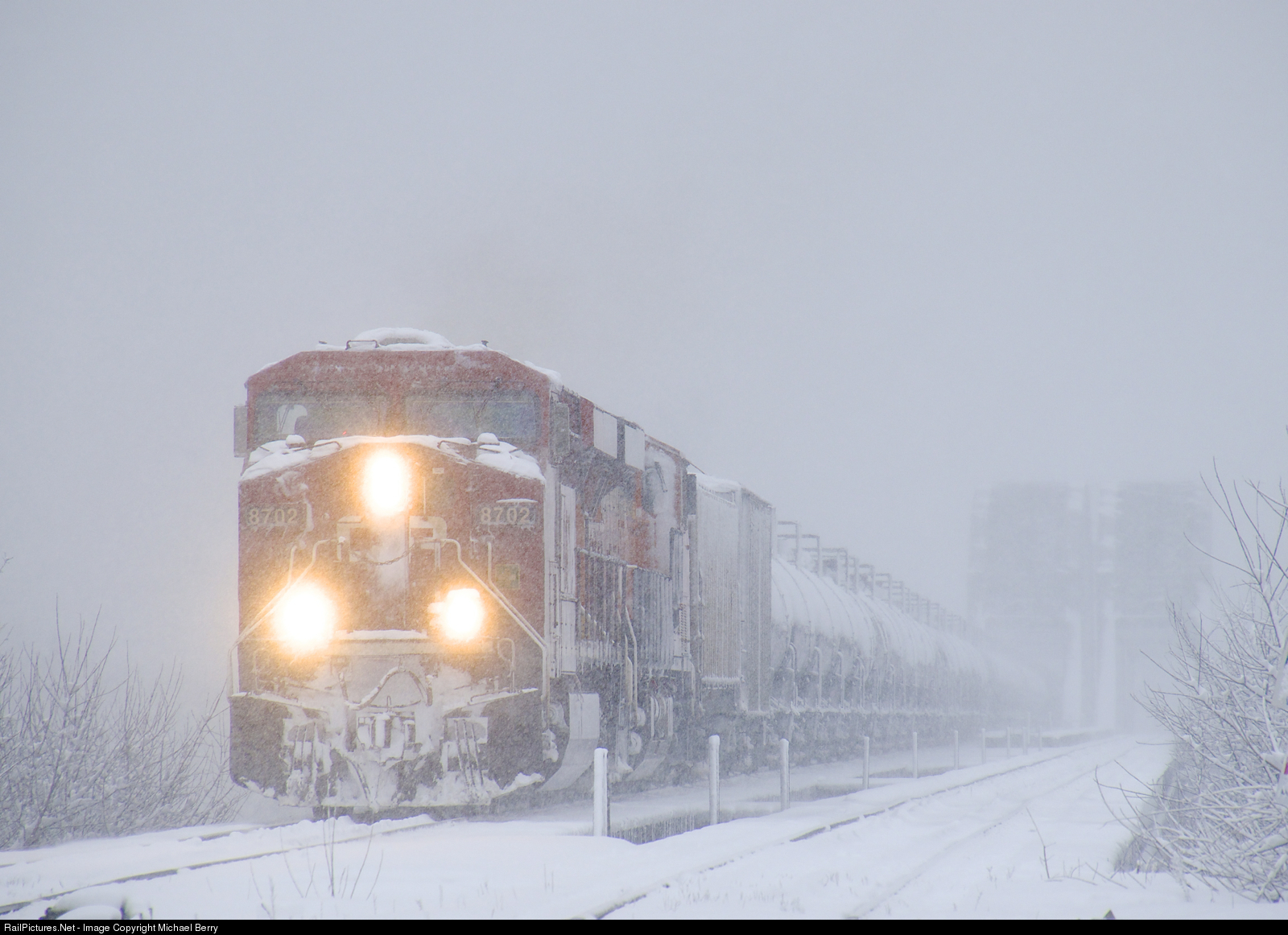 On the morning that Montrealers awoke to a decent amount of snow, CP 651 is approaching Lasalle station with CP 8702 & BNSF 8150 for power as the snow continues to fall.