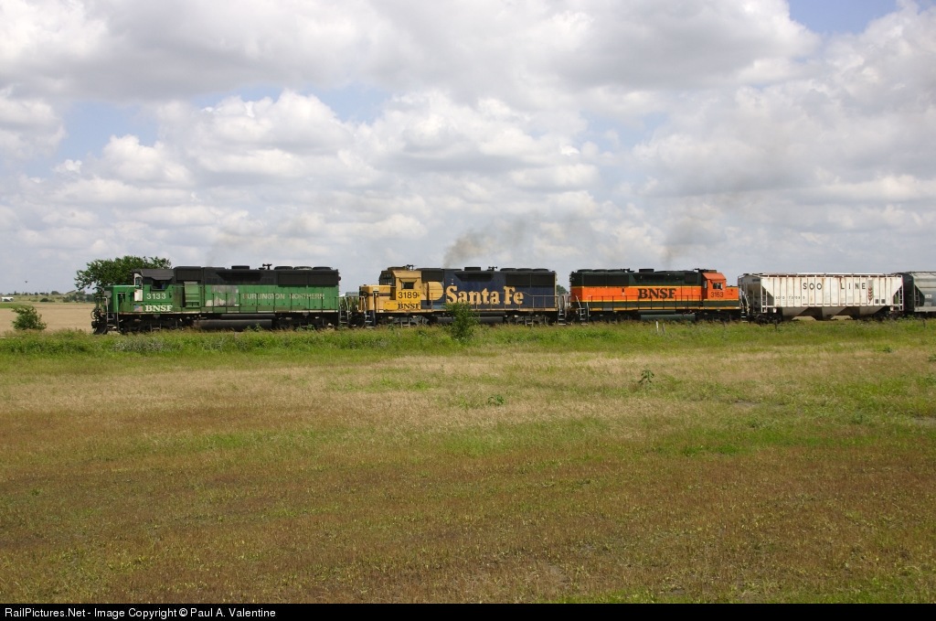 Interesting combination.Paint schemes for the old BN then ATSF and then the new combined BNSF all lashed together.