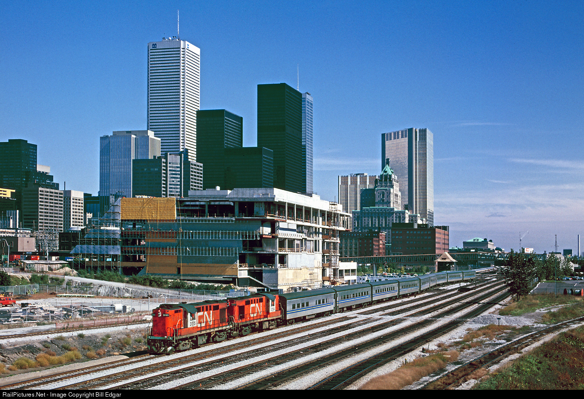 | CN 3155, an RS18U leads a westbound Tempo train (VIA) out of Toronto Union Station on a sunny afternoon in September 1981. The locomotive was built in 1960 as an RS18 and rebuilt for this service about 1967. Note the lack of a front walkway on the short hood. |