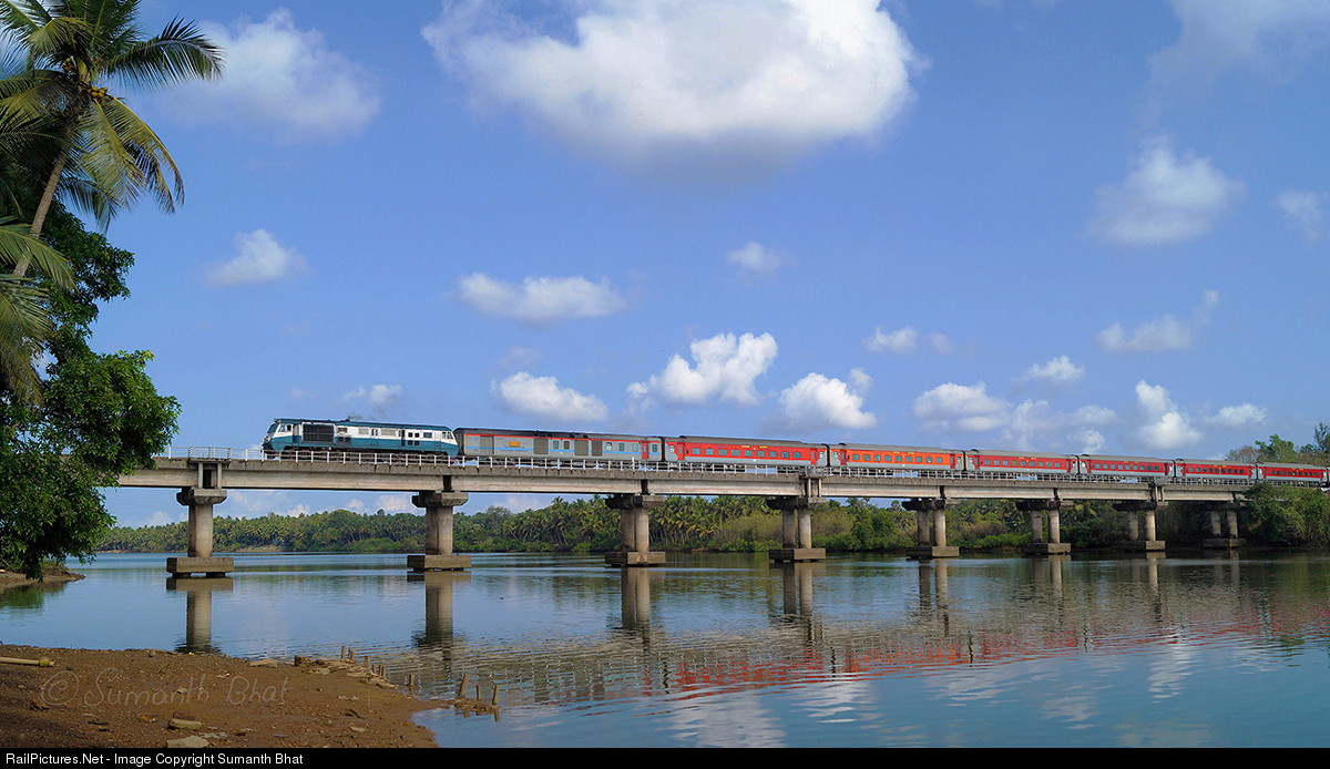 | 12223 Mumbai-Ernakulam Duronto Express with Kalyan WDP-3A crossing Swarna river near Udupi, Karnataka (India). |