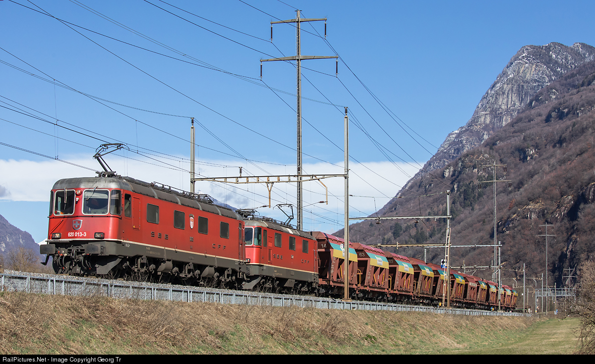 | Re 620 # 013 "Rapperswil" and Re 420 # 277 in multiple are pulling loaded gravel train 69739 from Hüntwangen-Wil via the Gotthard mountain line to Cadenazzo near Claro. |
