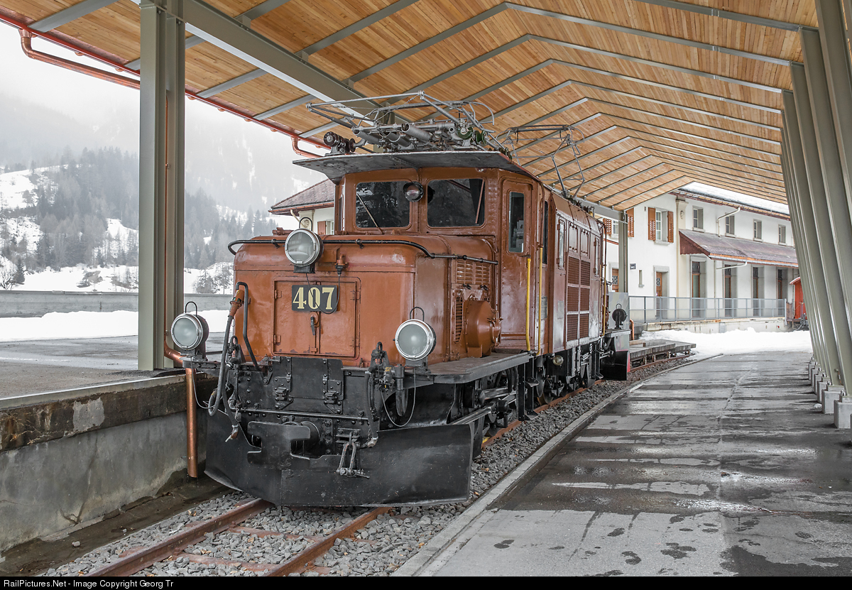 The "C-C" or "Rhaetian Crocodile" Ge 6/6 I # 407 got a new covered exhibition place in front of the Albula Bahnmuseum Bergün. # 407 was built in 1922 by SLM, MFO and BBC and withdrawn in 1985. Then it was exhibited in Zürich Altstetten by the Schweizerische Bankgesellschaft (SBG) which is now the UBS (Union Bank of Switzerland). Since 1994 back in Grisons and exhibited near the Bergün station. Now it got a new place and a roof in front of the museum. In the cab (black windows) is a modern simulator installed, where you can drive over the Albula line using the original controls in the cab.