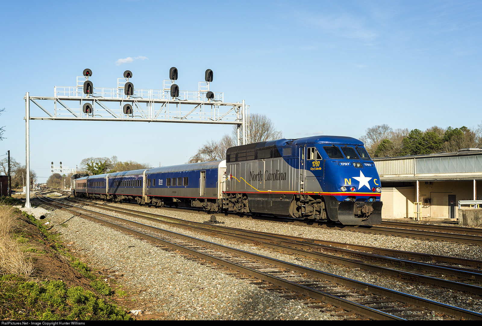 | Having just stopped at the depot in Salisbury, NC, F59PHI number 1797 brings up the rear of northbound passenger train 76 on March 18, 2018. |