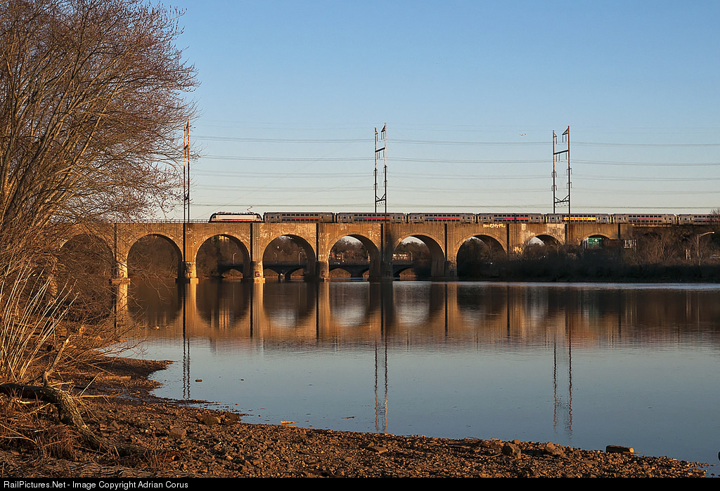 | The sun begins its final descent as an eastbound train to New York makes its way over the Raritan River by way of the massive concrete viaduct between New Brunswick and Highland Park, NJ on Amtrak's Northeast Corridor. |