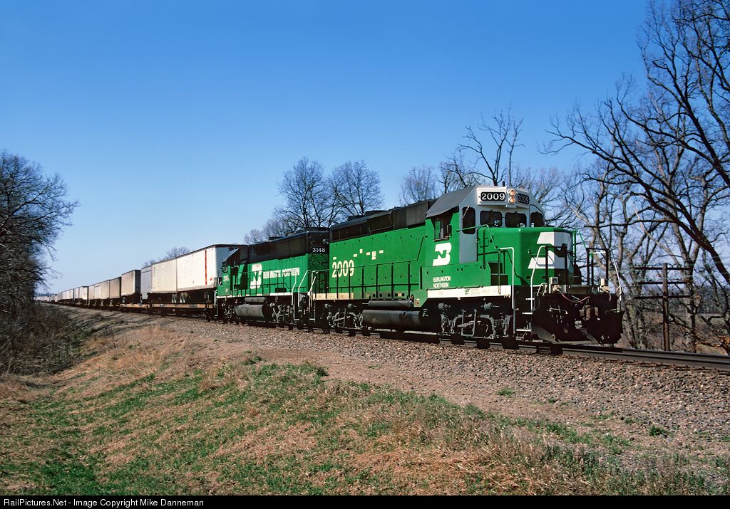 Growling Cat through Chana Burlington Northern GP20C No. 2009 leads “Expediter” piggyback train 42 through the Illinois countryside east of Chana on April 6, 1991. BN had ten of these EMD GP20s rebuilt with a Caterpillar engine, Nos. 2000-2009, rebuilt in 1988-90.