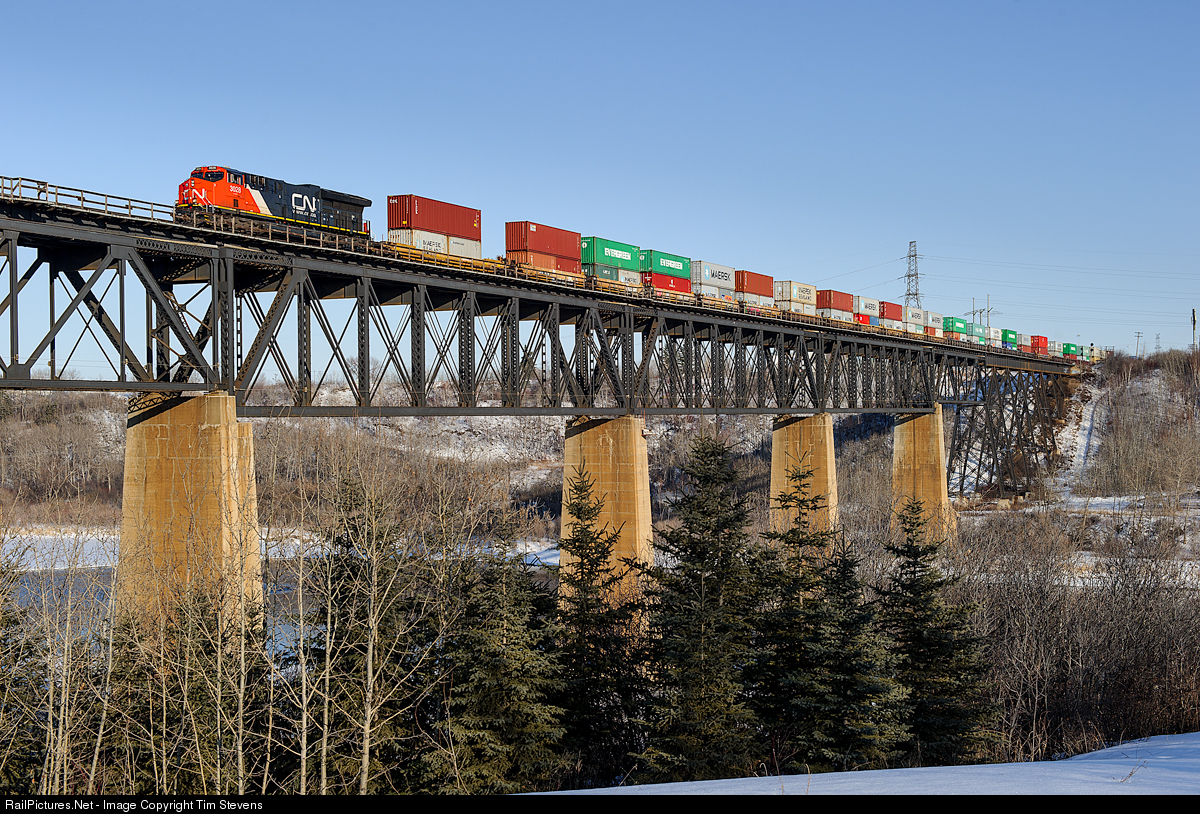 Chicago-Prince Rupert train Q191 crosses over the North Saskatchewan River between Bretville Junction and Bailey on CN's Wainwright Sub, just east of Edmonton.