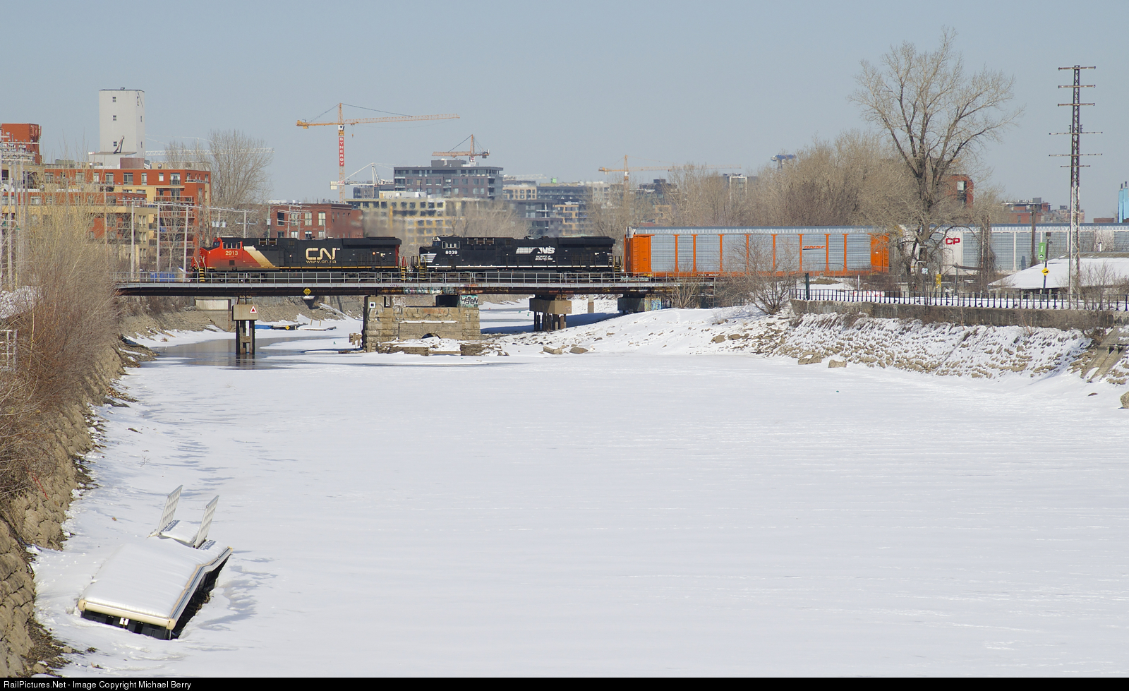 ES44AC's CN 2913 & NS 8039 lead CN 401 over the frozen Lachine Canal.