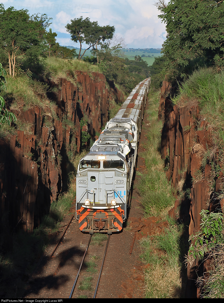 | Surrounded by rocky walls, northbound J679 run from Ribeirão Preto to Jardinópolis, led by SD70ACe-BB #8390 |