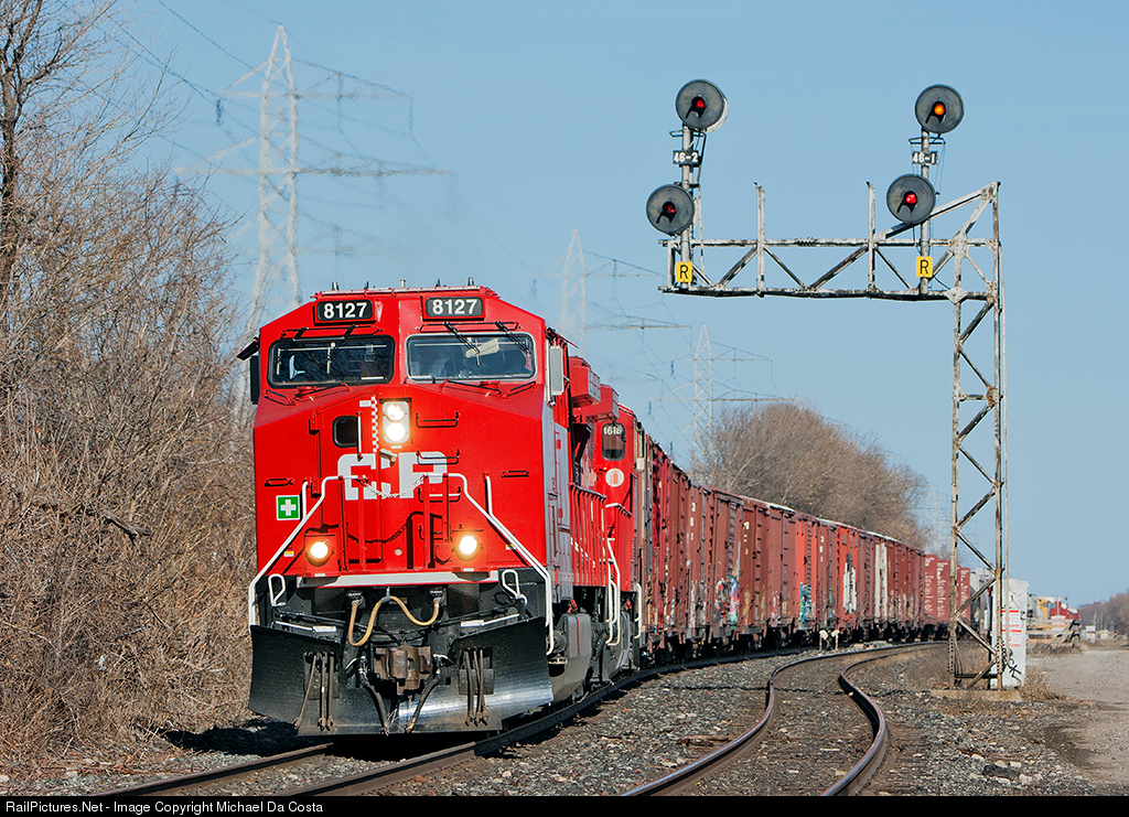 | Classic Bartlett Shot CP 8127 splits the intermediate signals as it leads a rather clean CP 8637 west towards Osler and the jct with the MacTier Sub, where the train will hang a right and head north. |