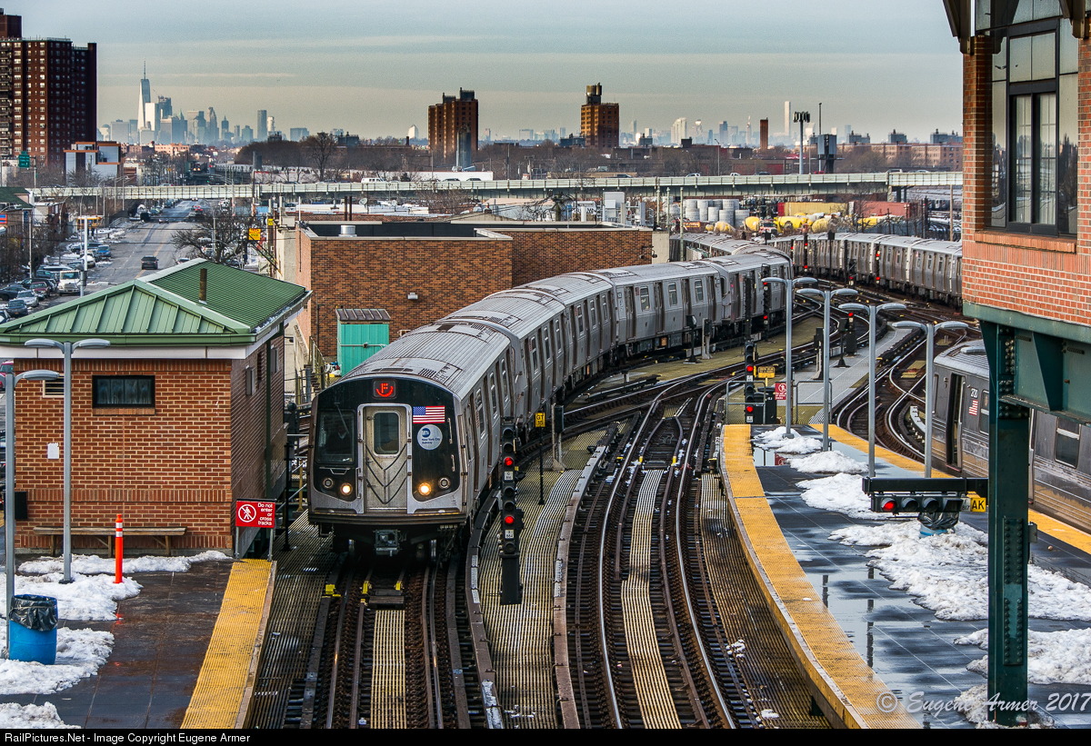 When a F is actually a D... At the Coney Island-Stilwell Avenue station, terminus for the D, F, N and Q trains, a F train is arriving off the D line from Manhattan, on a weekend when maintenance schedules had D trains running on the F line, and vice versa. This station has eight tracks and four island platforms. According to the New York City Transit Authority, this makes it one of the world's largest elevated transportation terminals, as well as the largest in North America.