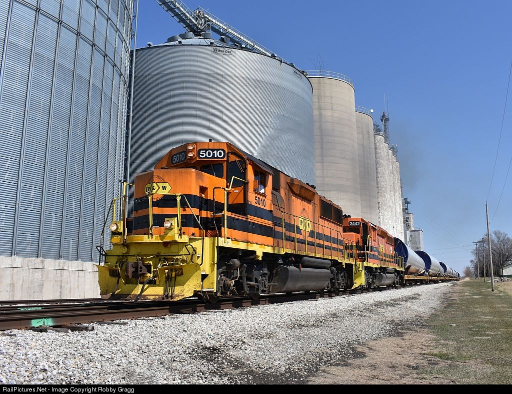 TP&W GP50 5010 leads a manifest which mostly consists of windmill parts west past the grain elevator in Weston.