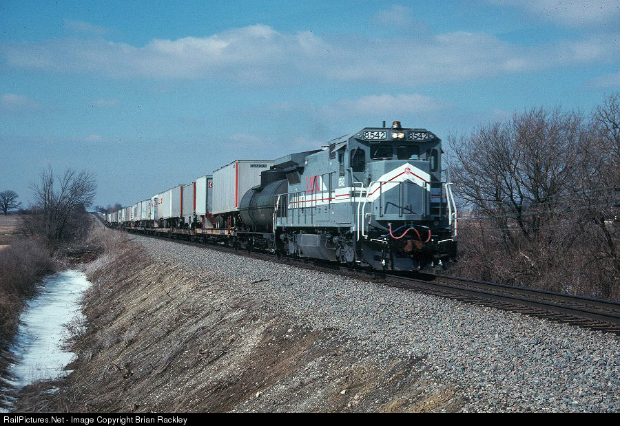 | LMX 8542, and a fuel tender, lead eastbound Expediter 46 on its approach to Flag Center, Illinois. |