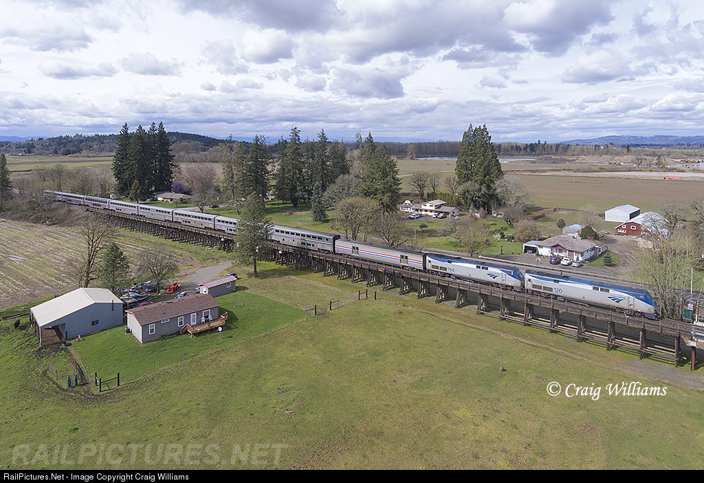| The Coast Starlight passenger train runs between Los Angeles to Seattle along the Interstate-5 corridor. Here we see the northbound #14 crossing the Santiam River near Jefferson, Oregon. Jefferson is located about 9 miles northwest of Albany on the UP Brooklyn Sub. I got permission from the owner for a shot of this neat old wood bridge. |