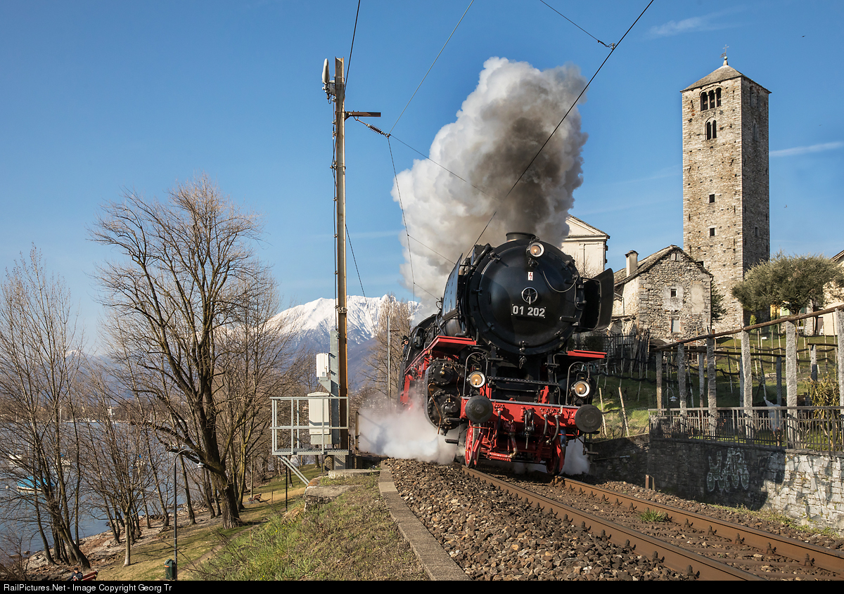 | A few minutes ago, the 13 car steamtrain of Eisenbahn-Nostalgiefahrten Bebra e.V. from Germany started the return journey from Locarno in the Ticino over the Gotthard line back to Germany. 4-6-2 "Pacific" 01 # 202 is passing the San Quirico church from the 14th century in Minusio, on the shore of the Lago Maggiore. |