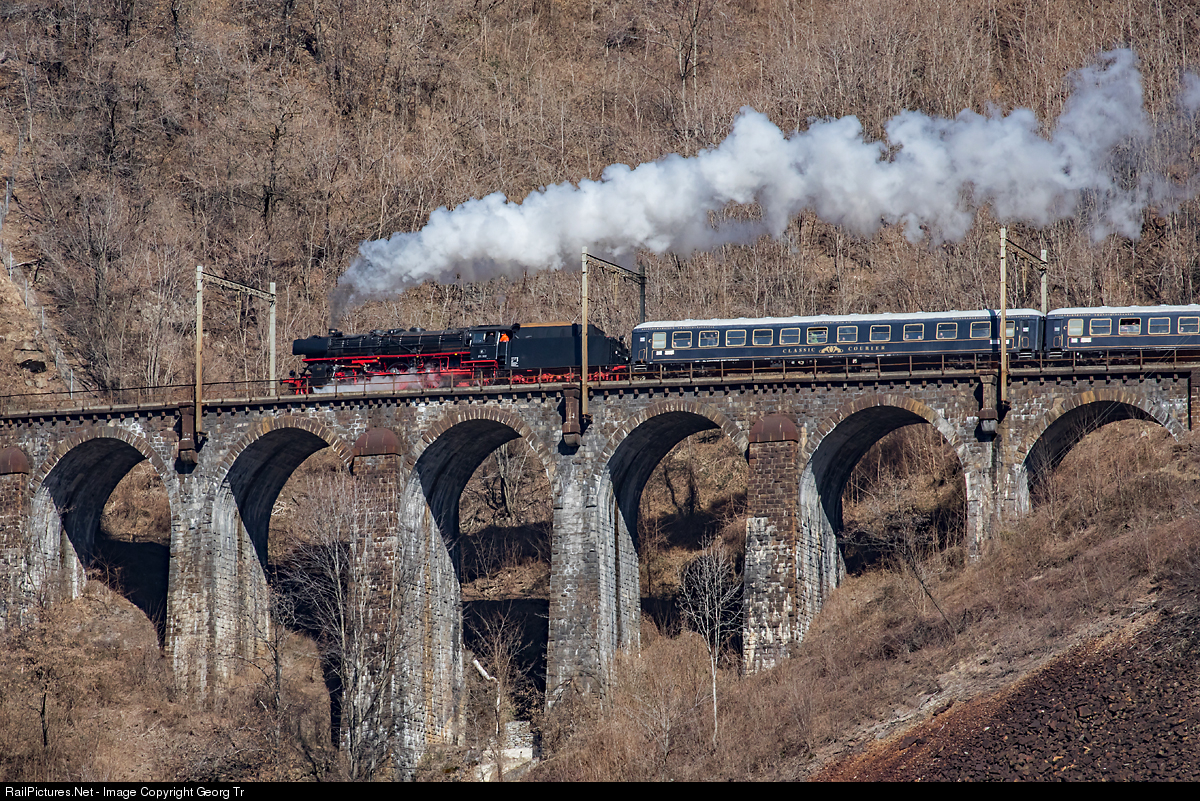 | The steamtrain of Eisenbahn-Nostalgiefahrten Bebra e.V. from Germany started the return journey from Locarno in the Ticino over the Gotthard line back to Germany in the morning. Now the 4-6-2 "Pacific" 01 # 202 is on the Gotthard south ramp in the Biascina on a grade of 2.6 %, crossing the Pianotondo viaduct. |