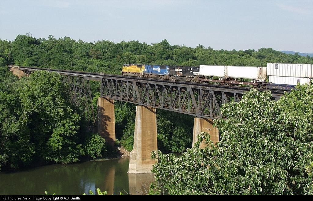 A colorful trio of units pulls a mile of containers and trailers across the Potomac River into Maryland.