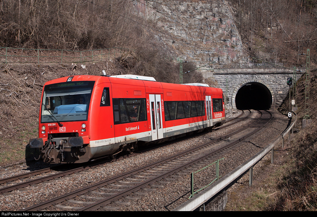 Diesel rail car 650 304 is leaving the Mühlenen tunnel on the way from Pforzheim to Horb am Neckar.