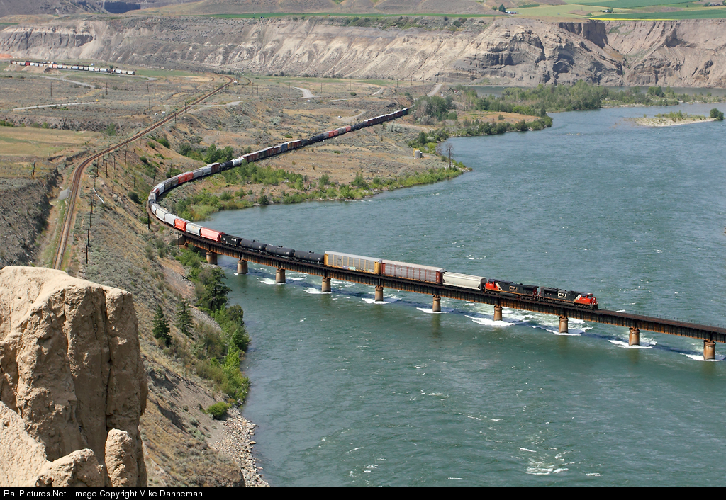 Canadian National train No. 416 crosses the Thompson River at Ashcroft, British Columbia, on July 22, 2011. To the left is the Canadian Pacific main line and a portion of dry port, Ashcroft Terminal, a private transloading facility, container storage and distribution center.