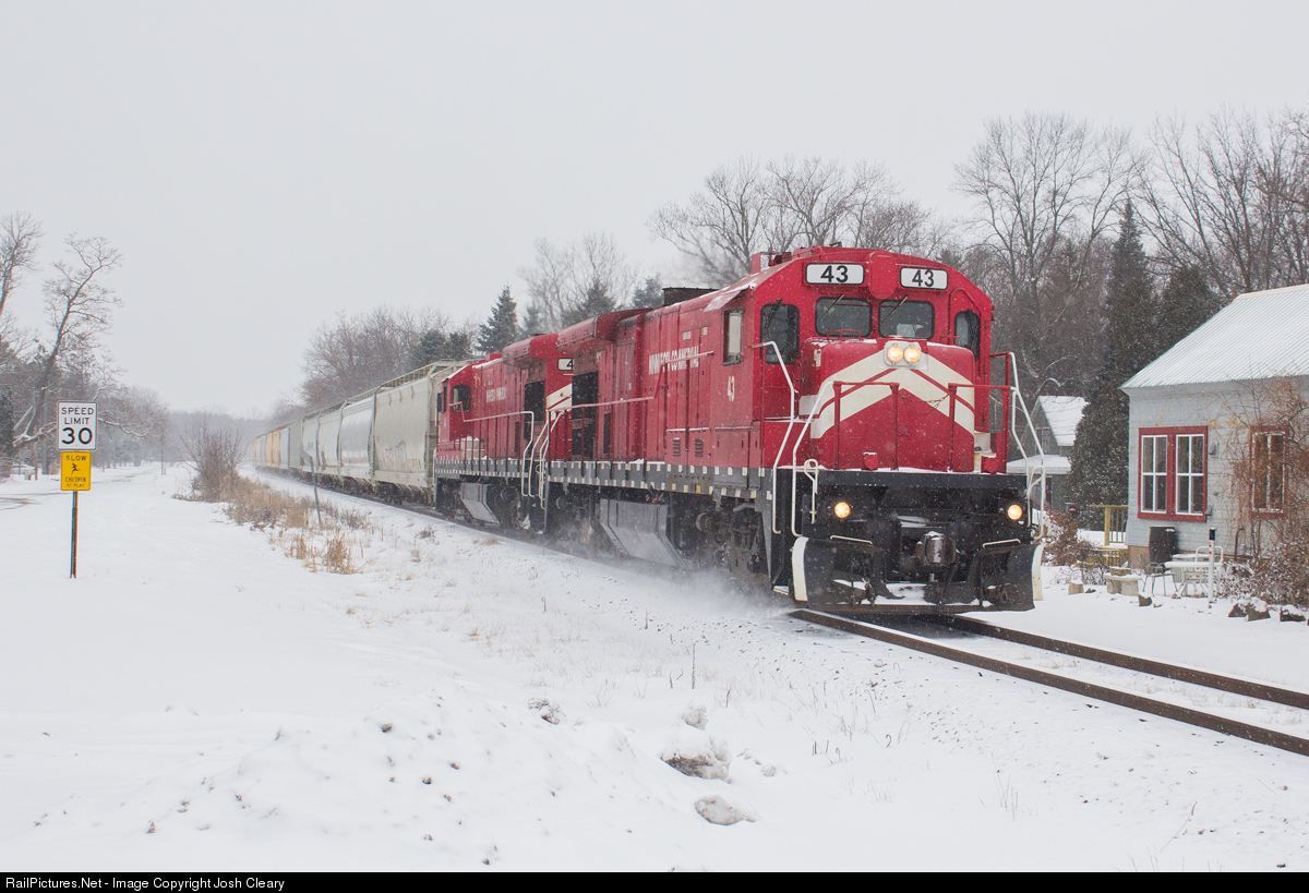 | Minnesota Commercial B23-7's 43 and 44 bring the last loaded Bayport job for Anderson Windows through Lake Elmo on a frigid winter day. A few months later, the Commercial sent out light power to fetch the empties at Bayport. PTC requirements on the BNSF unfortunately spelled the end for the MNNR's Bayport and Northtown job. Now, plastic pellet cars are trans loaded to trucks at the Commercial's yard and trucked the final few miles to Bayport. |