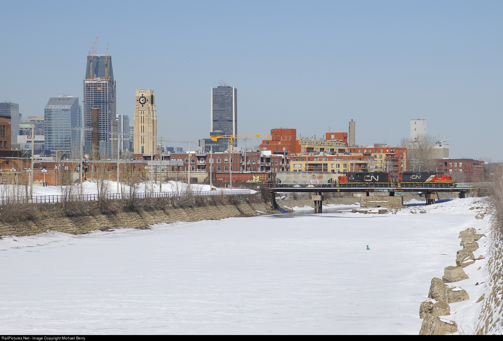 GP9's CN 7075 & CN 7226 are crossing the Lachine Canal with 22 grain cars in tow, heading from track 29 to Pointe St-Charles Yard.