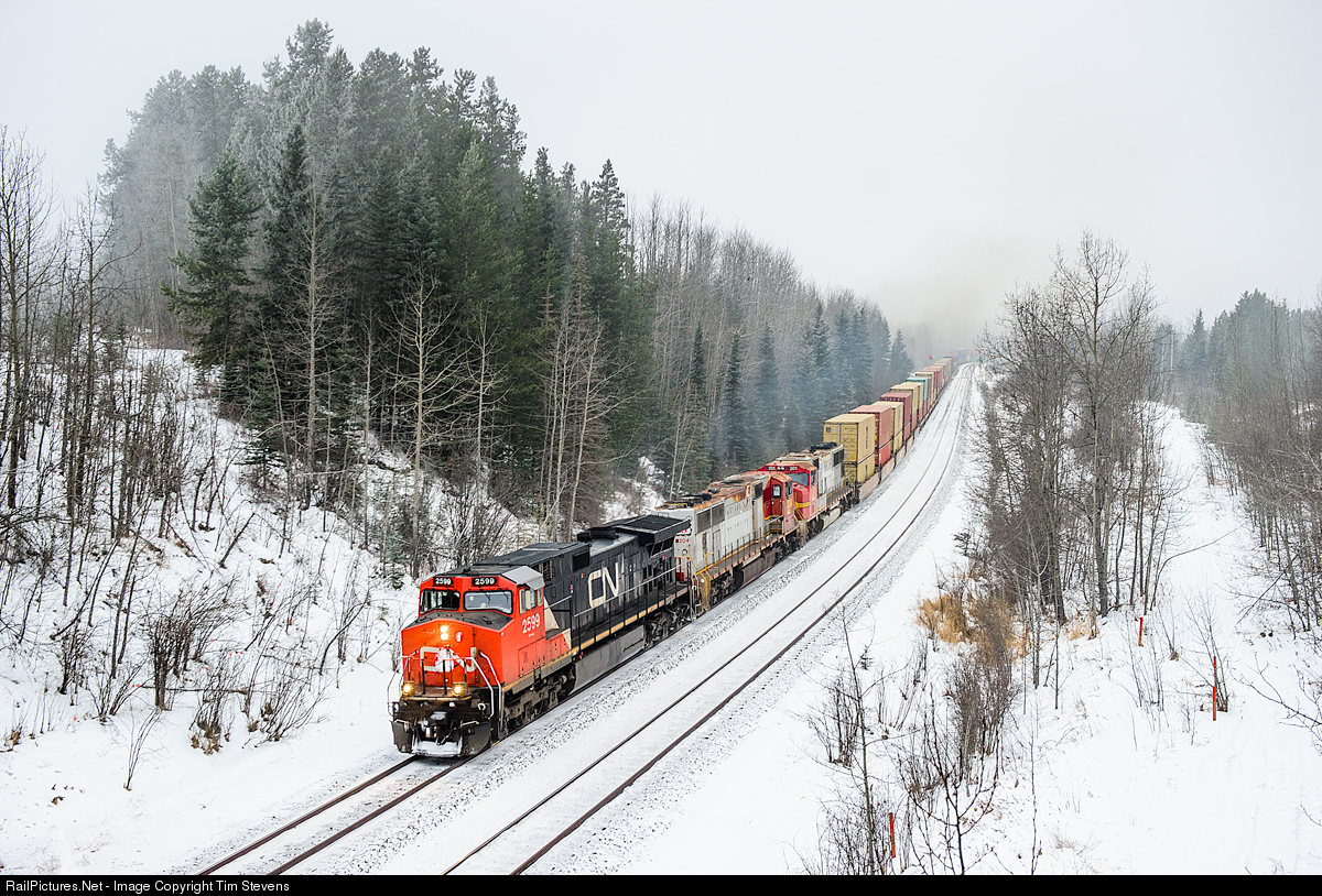 | CN C44-9W 2599, PRLX SD75Ms 204 and 201 climb through Obed with Vancouver-Chicago train Q118. The PRLX SD75Ms (ex BNSF/ATSF) were the first of a dozen or so leased units of that type to arrive on CN's property. |