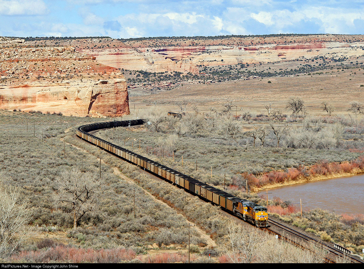 Leaving Ruby Canyon behind, UP 8758 follows the Colorado river for one last time at Westwater, UT. The tracks will soon head upgrade onto the high desert while the River will head through Westwater Canyon and then onto Moab.