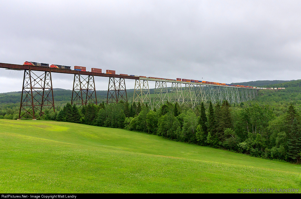 CN 8103 leads westbound train Q121, as they head across the 3,920 foot Salmon River trestle on Canada Day, 2016.